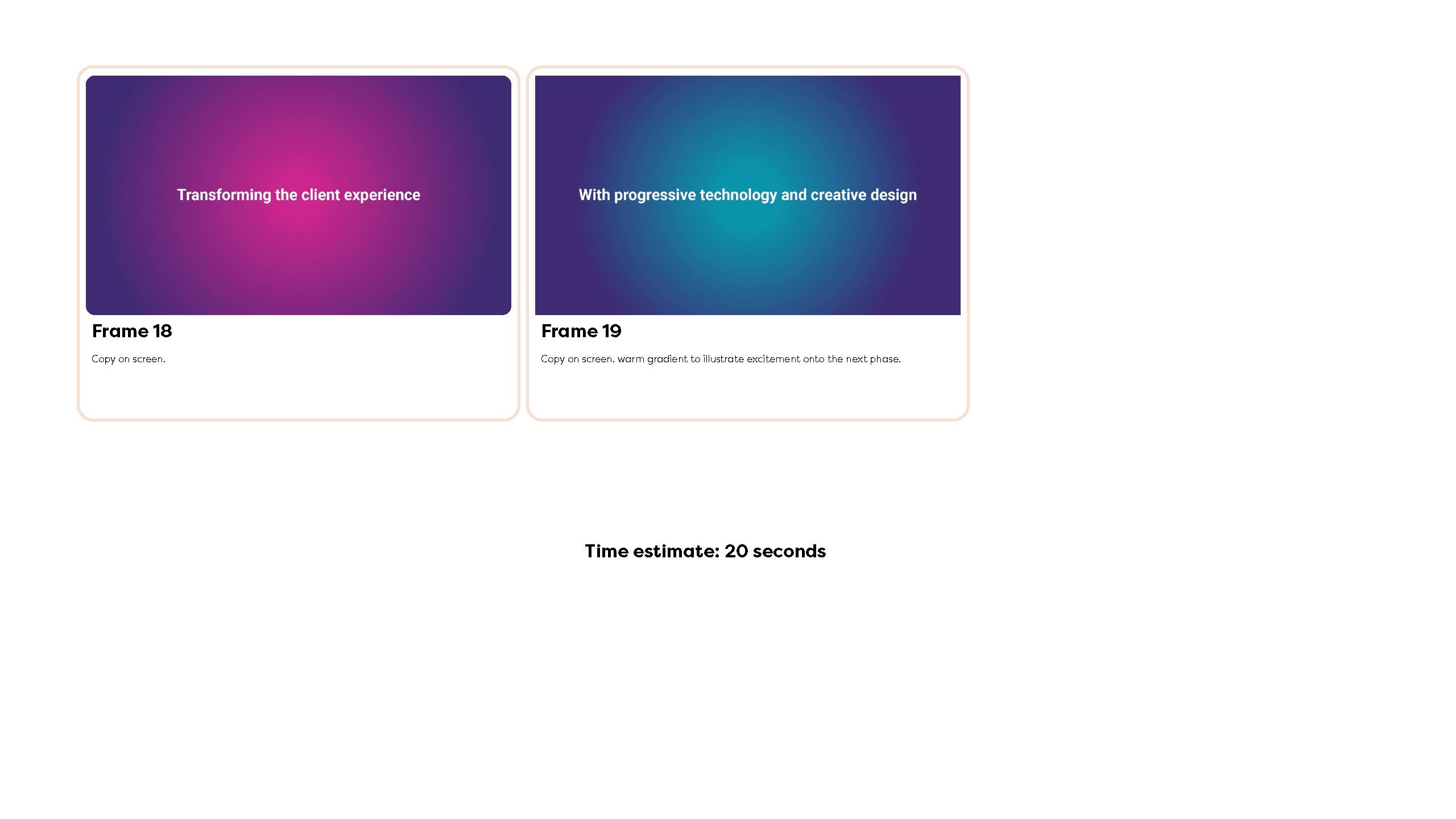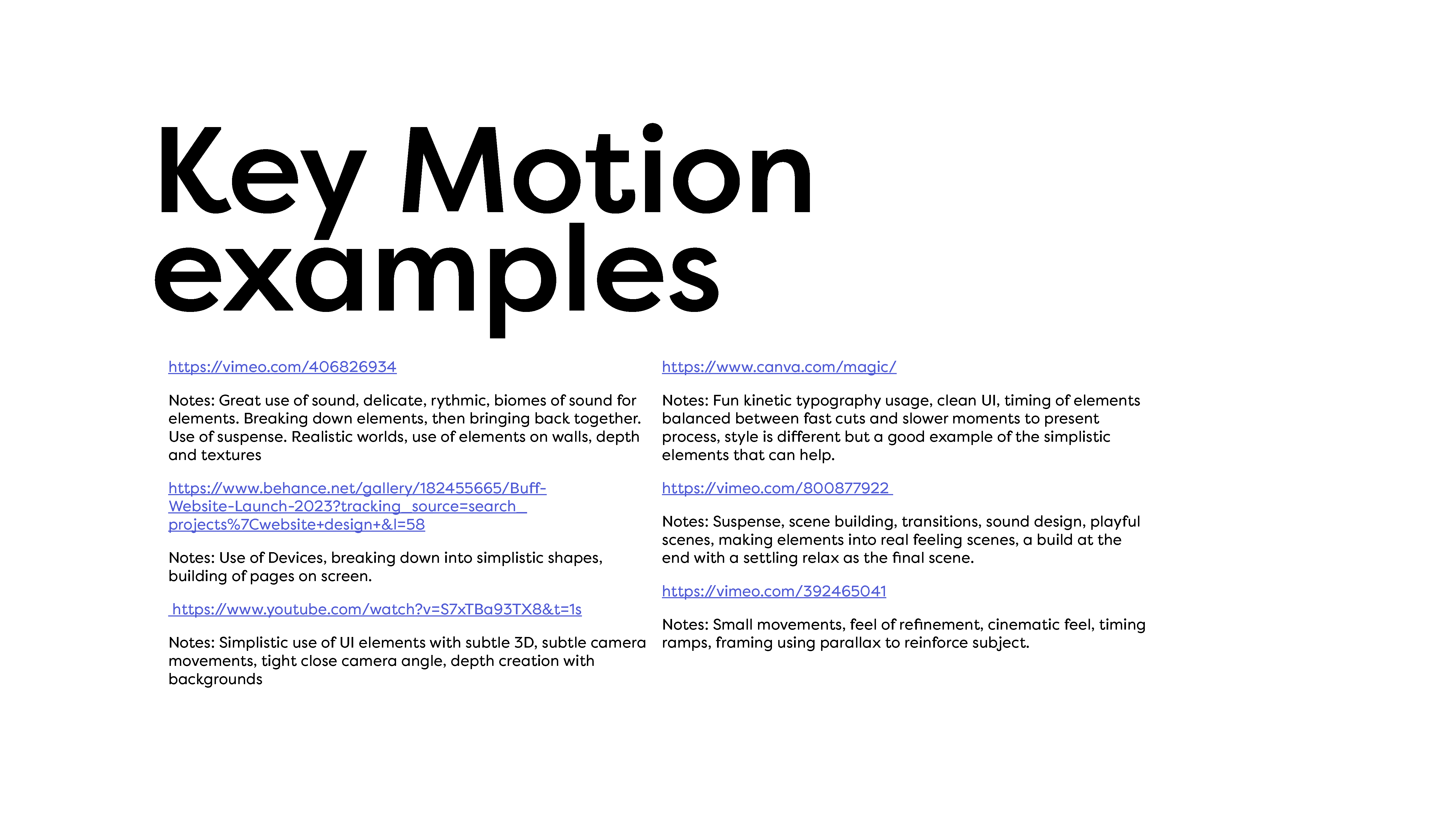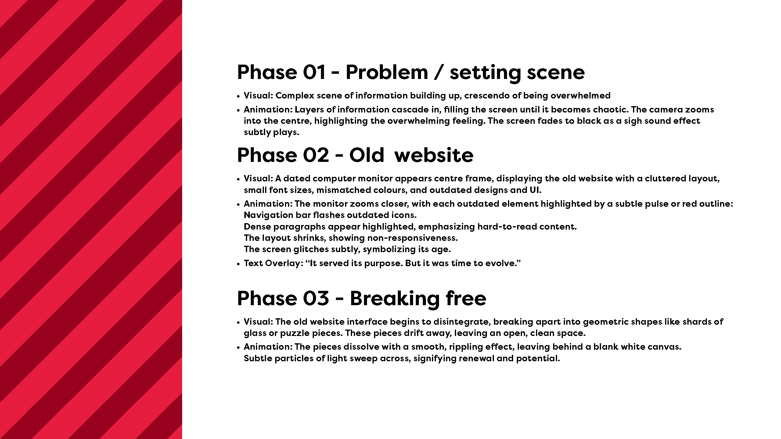Following discovery, I developed the overall vision for the project, defining the visual style, texture, lighting, and narrative structure. This stage was about reflecting back what I’d heard and understood, while proposing how motion could best support clarity, usability, and engagement. I also shared relevant motion references to help align expectations early.