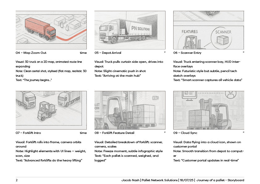 A series of storyboard sketches were created to break the logistics process into clear stages. These early frames explored how each step of the network could be visualised, from pallet collection and depot handling through to hub processing and final delivery.